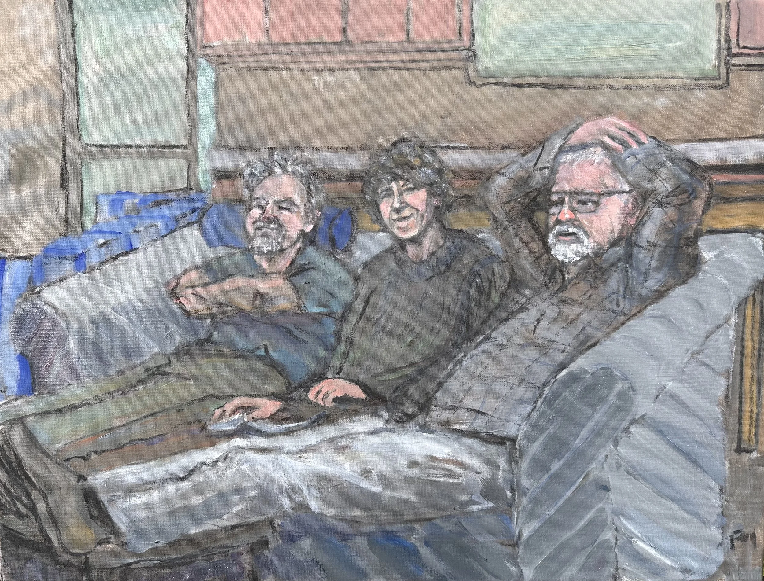 Ann, Pat, and Mule, 2023 oil on canvas 18” x 24” (Dickens)