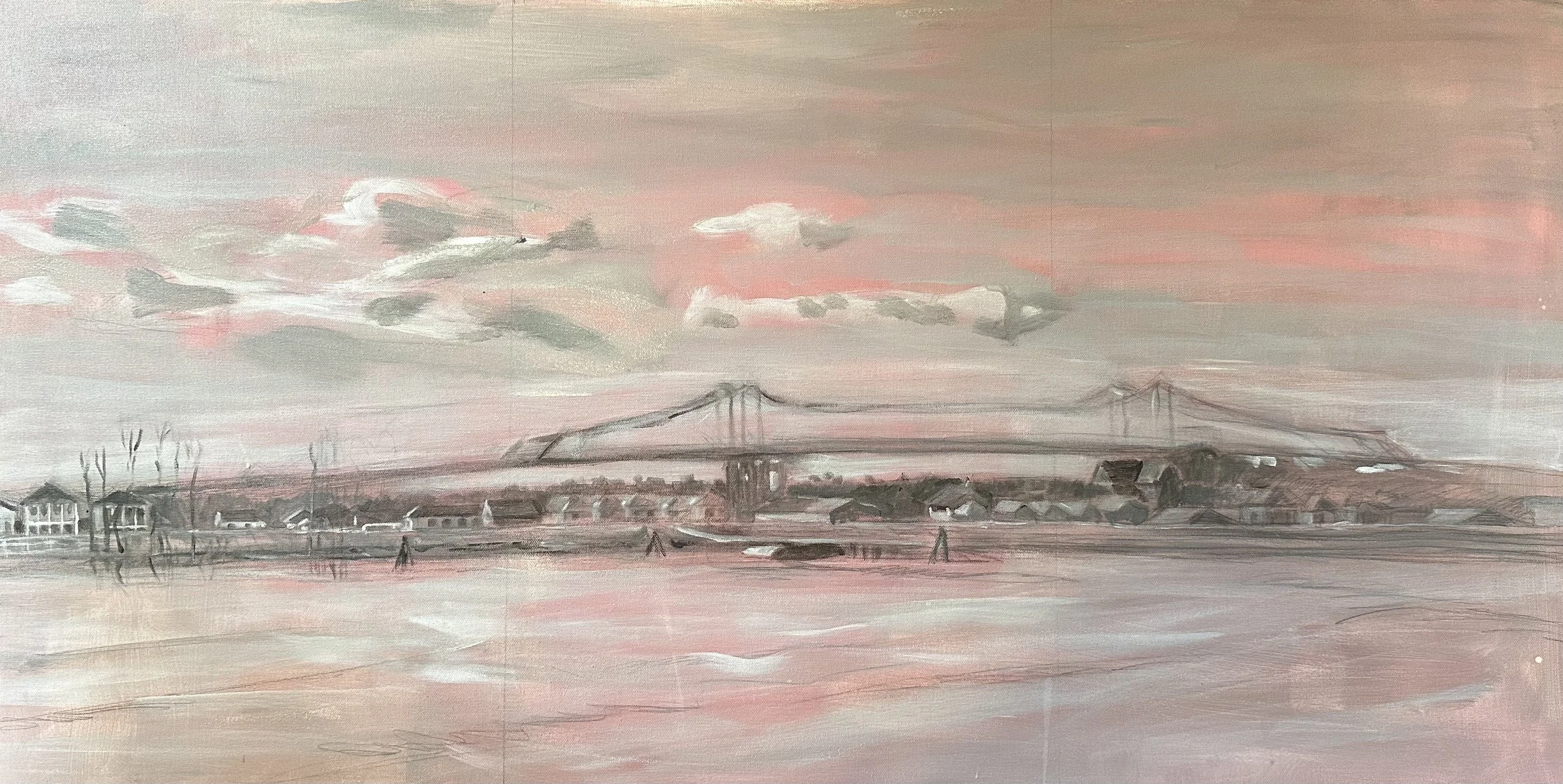 The next step was to prepare a single large canvas for a return engagement. In July, I drew it out on a 24 x 48 in the Trust studio and made plans to go back.